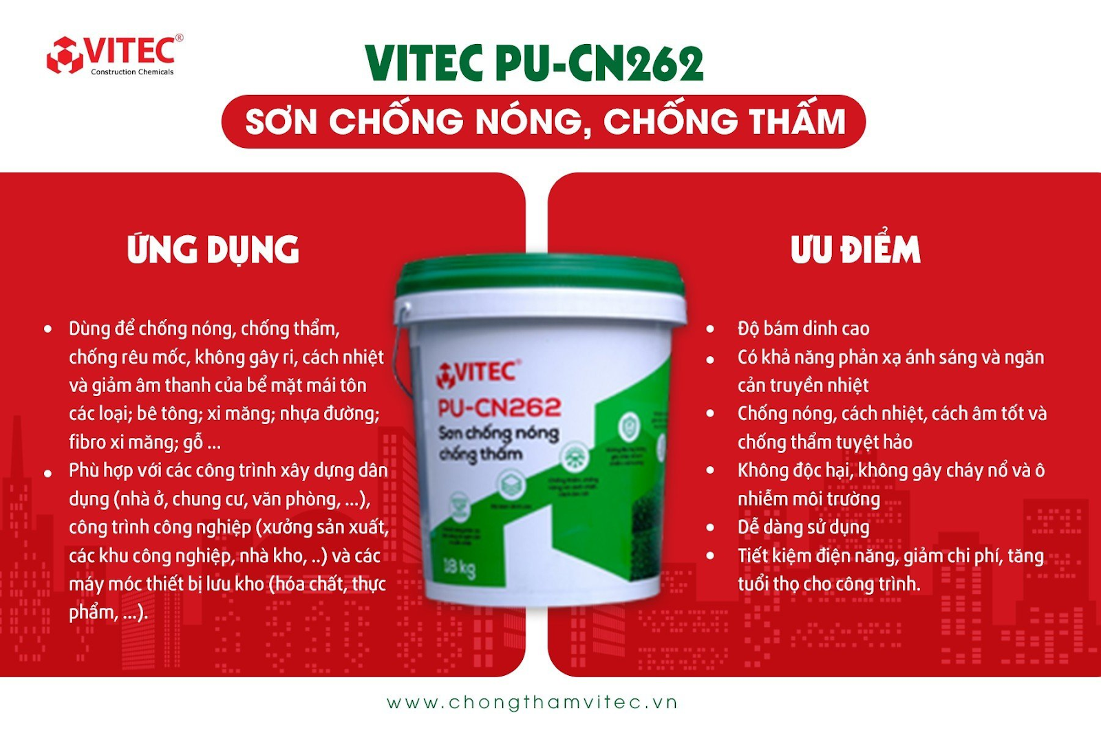 VITEC PU-CN262: Giải pháp chống thấm và chống nóng 2 trong 1. Với thành phần đặc biệt, sản phẩm không chỉ tạo màng chống thấm công trình hiệu quả mà còn có khả năng phản xạ phần lớn bức xạ nhiệt mặt trời, giúp giảm nhiệt độ bề mặt sàn mái bê tông hoặc mái tôn, tiết kiệm chi phí năng lượng cho điều hòa trong mùa hè oi bức tại Hà Nội.